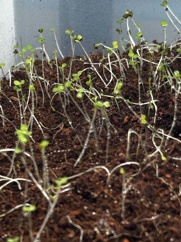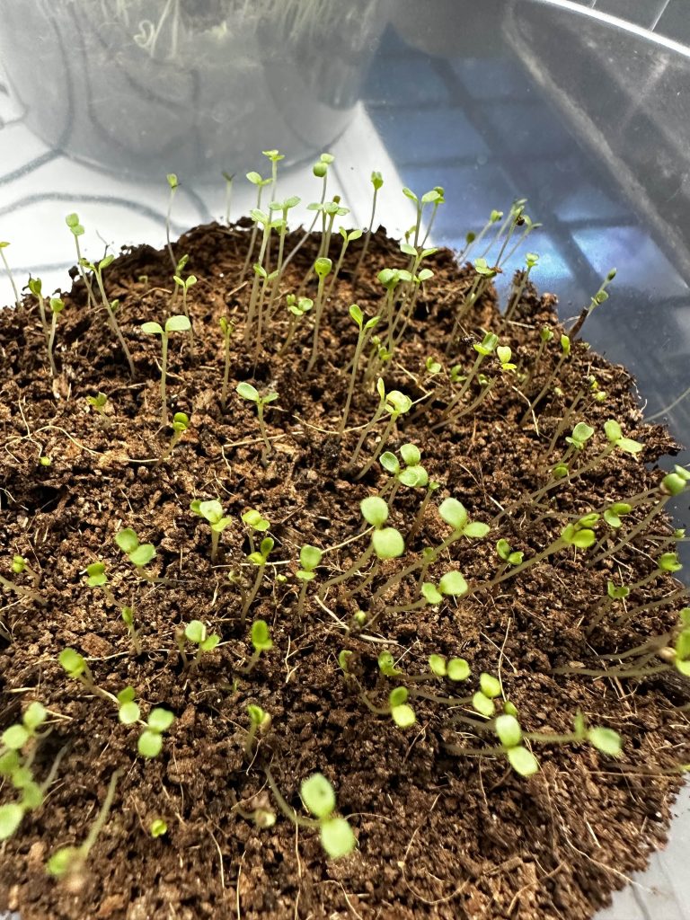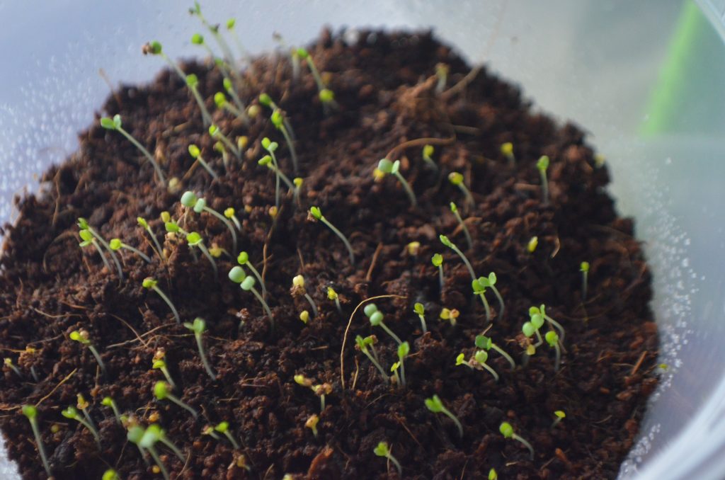 You will see tiny shoots extending from the soil, the seeds have sprouted! This means its time to set aside that lid (please re-use these containers in your kitchen or garden or bring them back to me for store credit). Now the greens need some light, find a spot with some natural light or under your very own grow light.